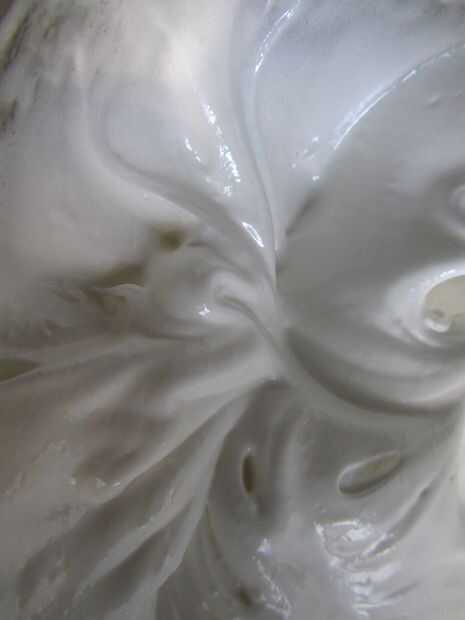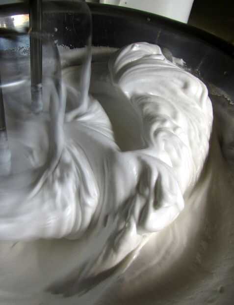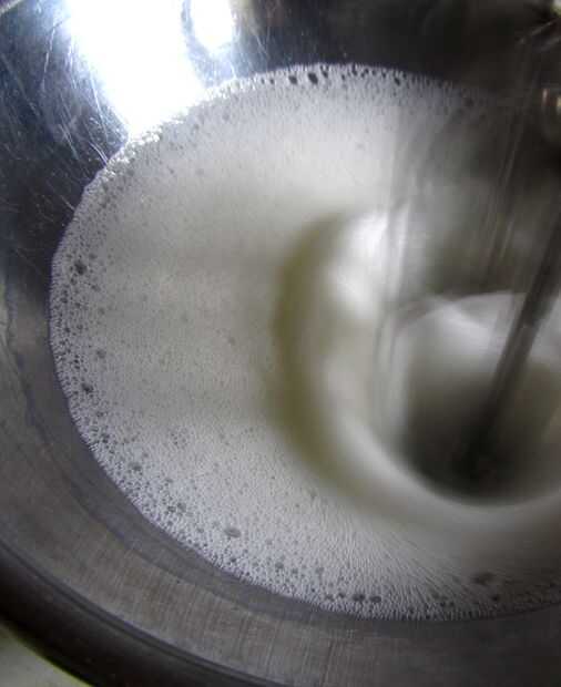 - En primer lugar, batir el huevo hasta espumosos. En este momento añadir el cremor tártaro y continúe azotes hasta tieso picos, donde los blancos permanecen de pie alto cuando usted quita la bata.