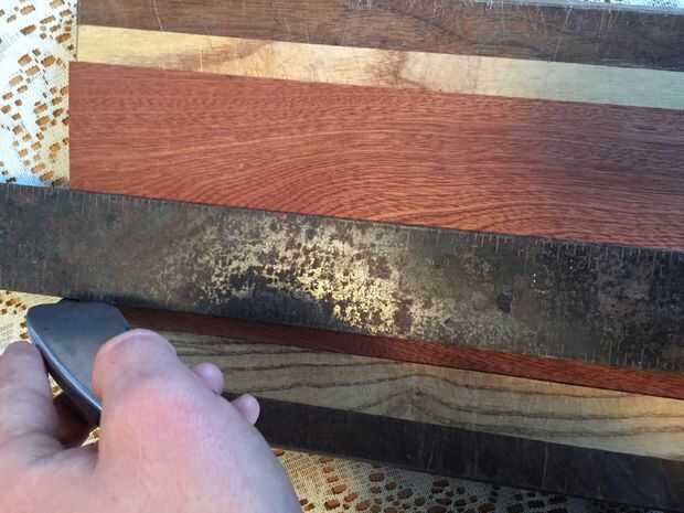 Para empezar, utilice un borde recto para cortar una pequeña tira hasta un lado de la chapa. Use una navaja para marcar ligeramente la madera. Usar el peso del cuchillo para cortar. No necesita empuje sobre la hoja, dejar que el cuchillo haga el trabajo.