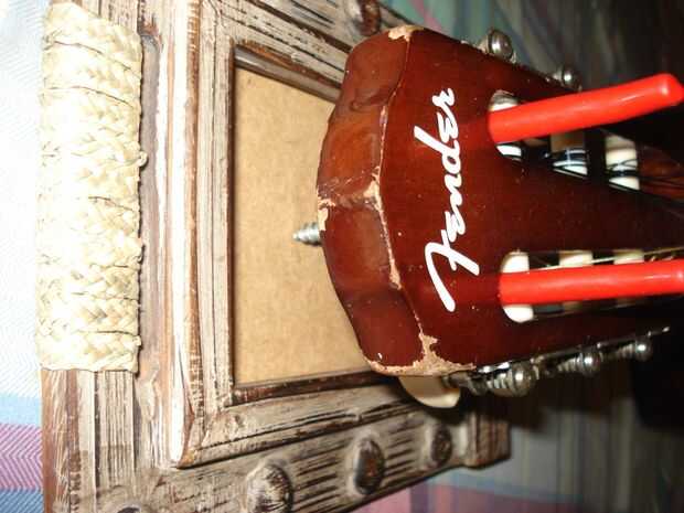 Construido un colgador de guitarra simple de un registro y unas cañas. Tengo un stand de guitarra pero ocupa espacio en el piso y con los niños corriendo no seguro ya. Tengo unos registros de colocación alrededor y cuando comprobé que estén limpios y