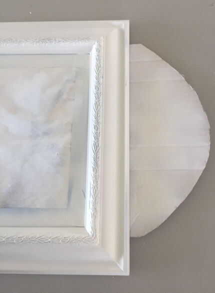 Asegúrese de que su marco de espejo se limpia y luego darle una capa de pintura en aerosol. Sólo usé un blanco plano. No quería que mi ser demasiado brillante. Se puede ver en esta imagen como el papel y la cinta están protegiendo el cristal. No se olvide de pintar el cartón así.