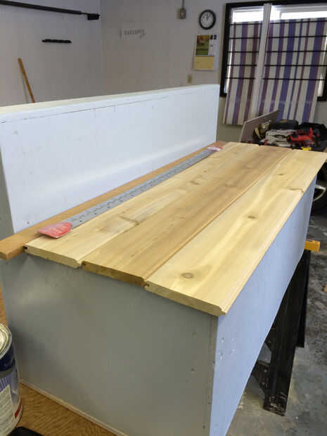 3 - Ponga la tira de madera y los tableros de cedro (con un pegamento) a Asegúrese de que usted como cómo la tapa se verá en términos de más caída.