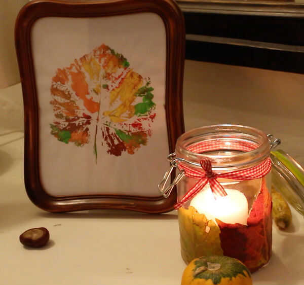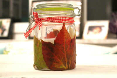 El siguiente es un tarro de linterna de real otoño hojas. Se coloca una vela dentro y el tarro entero ilumina revelar cada detalle de las hojas hermosas. Esto añade ambiente a la casa.