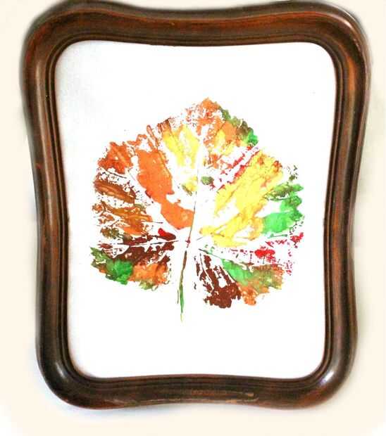 La primera es una hoja de otoño colorida impresión, creada por mi hija Emilia, presentada en un marco de madera vintage.