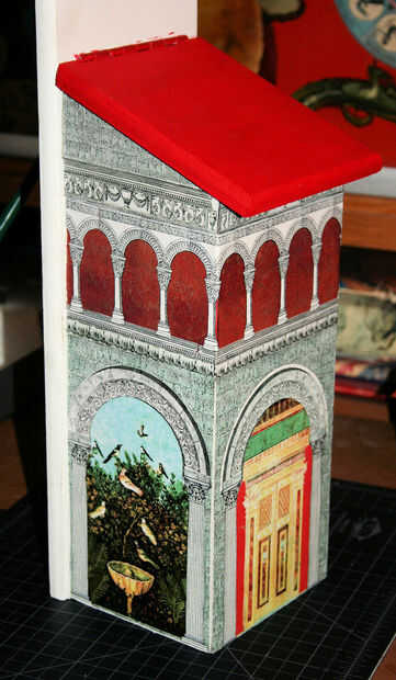 A continuación vas a adhiera las guías arcos a lo largo de dos lados, a lo largo del borde inferior de la moldura superior, encima de la pared roja. Únalos con cinta adhesiva los arcos una vez que ha secado-les para dos lados. Esta foto es de los arcos terminados, pero va a utilizar los grandes pedazos de los arcos de la guía, además de una pequeña parte de un arco para que encajen perfectamente para el respaldo. Es importante tratar de no haber cortado los bordes en las esquinas. Aquí te darás cuenta que tengo una astilla pequeña de la caja en la esquina cercana, que será retocada con pintura. Esto sucedió porque se me olvidó comprobar el ajuste seco antes que encolar. Usted no puede ver el error en la pieza acabada. Decoupage se puede perdonar si terminas bien.