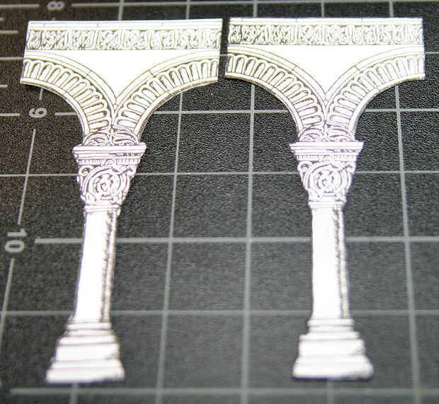 La imagen muestra un elemento de arco sin marcar a la izquierda y un arco con bordes negros a la derecha. Ver la diferencia que un borde oscuras. Ejecute el borde de cada arco contra el lado de un marcador Sharpie, deslizándose a lo largo sin parar. Hace invisible el borde cortado. A lo largo del lado del marcador le impide accidentalmente la parte delantera de la marca.