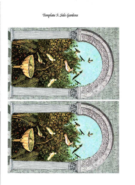 Aquí es el arte que se necesita. Realizar más de una copia para trabajar con, y si sólo tienes una impresora de chorro de tinta debe sellar ambos lados para proteger la imagen de la cola. Cada impresora tiene sus límites, pero éstos deben imprimir el tamaño correcto. El jardín imágenes para ambos lados deben ser 7 pulgadas, por ejemplo. Los elementos de arco deben ser 2 y 3/4 pulgadas de alto en la columna. La cubierta de teja es mucho mayor en el caso de hacer un corte de error alrededor de la bisagra en la parte superior de la tapa. Recuerde a sus tijeras de ángulo al cortar, producir un borde más fino y ennegrecer el borde cortado para que desaparezca. Los tamaños de archivo son el más pequeño podía hacer sin perder detalle. Porque hago detalles dimensiones sobre todo en el arte blanco y negro, hacer extra para hacer los arcos y columnas mirar más profundo. Se puede capas mientras están húmedas con el Mod Podge.
