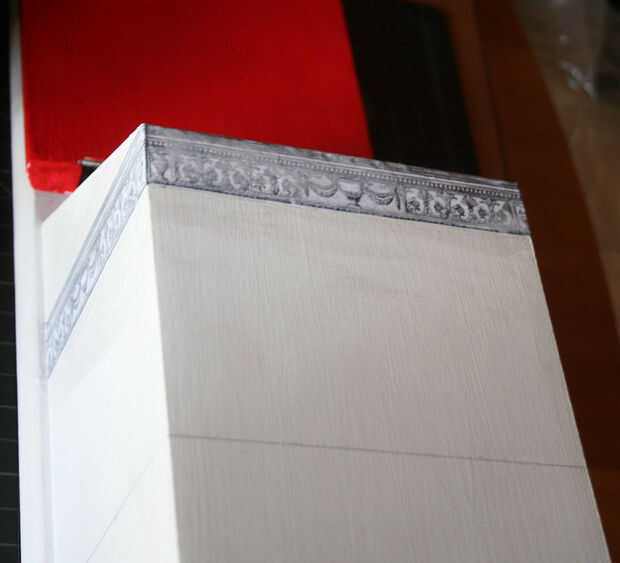 El siguiente es la pared roja, la parte más oscura que la parte superior. Puede seguir adelante y adhiera el moldeado de la hoja en la parte superior borde inferior de la pared. Por encima de este añadir el extra le cortó la imagen de la moldura superior (las líneas rectas y dentículos) de moldeo. Dar la sección toda una capa limpia de la cola. Consejos: Trabajar rápidamente y ser muy cuidado de alinear las esquinas perfectamente mientras que el Mod Podge es todavía bastante húmedo. Colocar pegamento sólo de la pieza que se pega. Limpie el pegamento fuera de la zona con una toalla húmeda porque secadas trozos de pegamento se producen terrones. Pegamento seco limpio fuera de su alcance antes de coger la pieza siguiente establecer. Materia seca puede ponerte duro el papel y tratando de tirar los dedos lejos del rasgón.