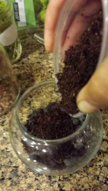 2. ahora Vierta las macetas en el envase. El nivel del suelo debe estar poco por debajo de la mitad de la taza de vidrio.