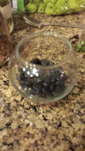1.1 primero comience por colocar la roca negra en la parte inferior del tazón de fuente. Yo diría que cerca de 1 pulgada o más dependiendo del tamaño del tazón de fuente.