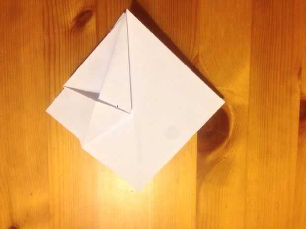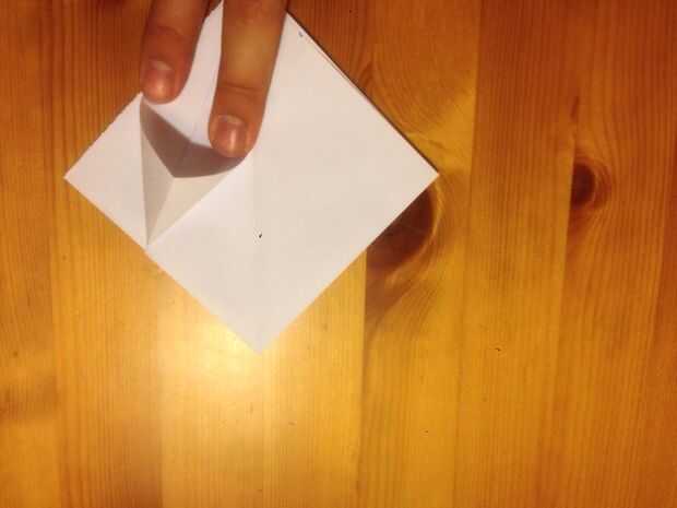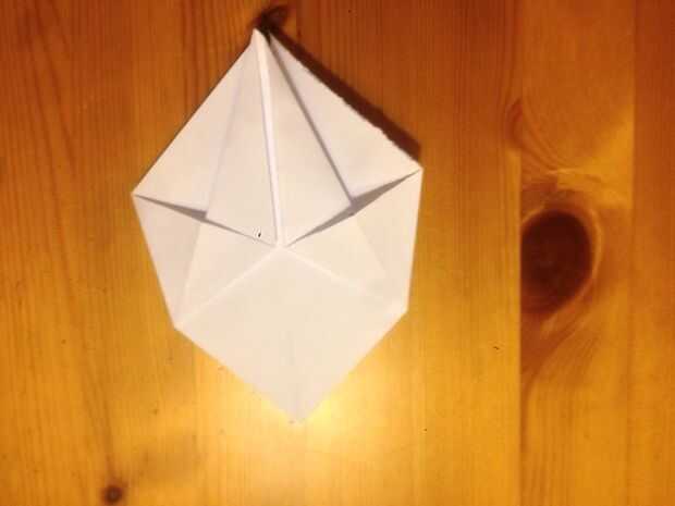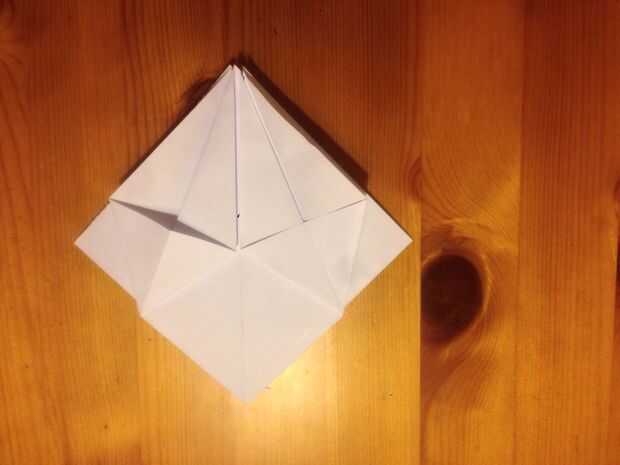 Ahora tienes que abrir el doblez que hiciste en el paso anterior y aplanar hacia fuera como se muestra en la imagen. Una vez que hayas hecho esto tienes que hacer en los cuatro lados de la rhomb. para que voltee el papel y repita este paso en todos los lados hasta que su doble es similar a los cuadros proporcionados.