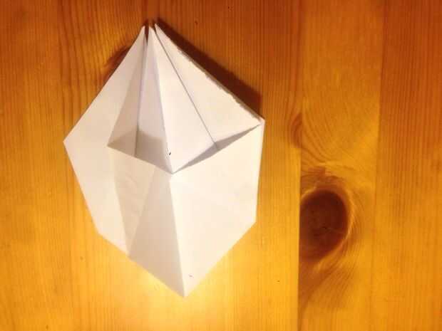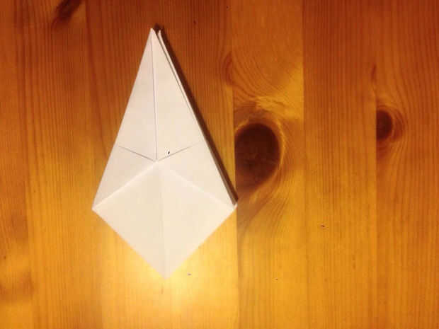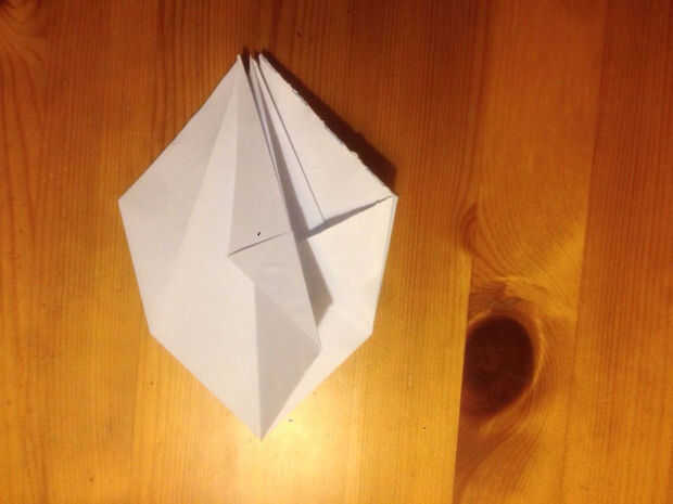Ahora dobla los pliegues que se crearon en el paso anterior y doblar la mitad de cada esquina en el lado no utilizado entre los dos lados "principales" y doo así a todos los rincones hasta que parece algo así como la flecha de cabeza de forma que se muestra en la imagen.