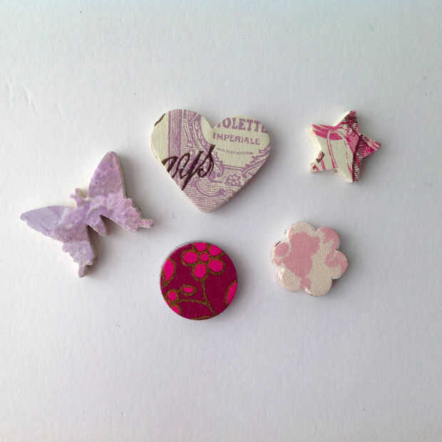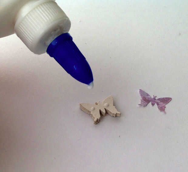 Con pegamento blanco, poner una capa delgada en la parte superior de cada botón por lo que es pegajoso y no resbaladizo. Cuidadosamente Alinee las formas cortadas de papel con sus botones correspondientes hasta que se colocan perfectamente. Lisa hacia abajo con firmeza teniendo cuidado de no mover la pila o la capa superior fuera de lugar. Deje que se seque completamente.
