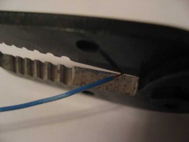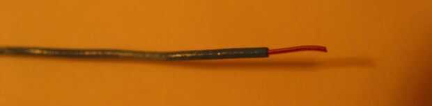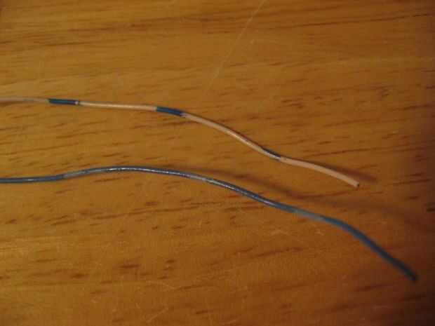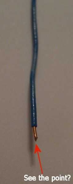 Si se puede juzgar el tamaño de los cables de esta foto y vas a estar en buena forma. El cable debe ser ligeramente más gruesos que los agujeros de la placa de circuito y un núcleo de cobre sólido (no filamentos). El alambre que usé era de un viejo gato de teléfono y es calibre 26. Pele sobre un 1/4" del aislamiento de los extremos. Ahora toma el cortador de alambre y mantenerlos en un ángulo de 60 grados al alambre. Usted querrá cortar el alambre 1/16" y 1mm desde el extremo del aislamiento. Corte el alambre en un ángulo para darle un punto agudo.