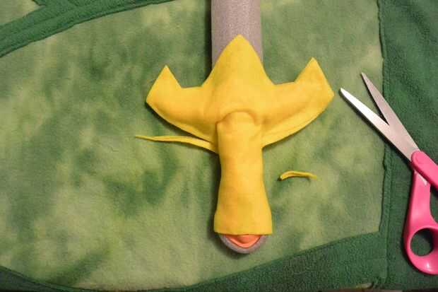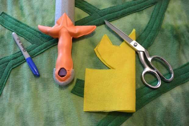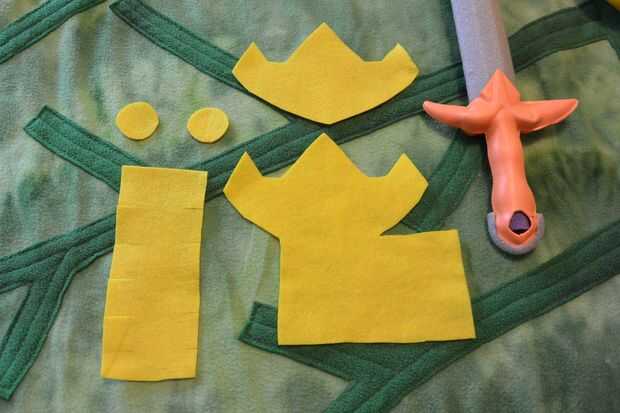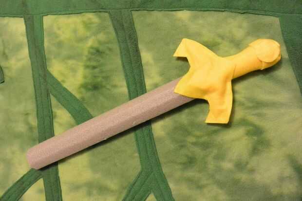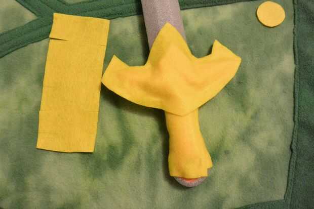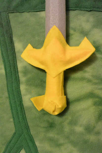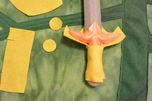 Ahora es el momento para cubrir tu espada en fieltro y darle ese instinto de héroe distinto. A través de ensayo y error, he encontrado que necesito tres piezas para cubrir el mango de la espada (como en la fotografía superior) más dos pequeños círculos para acabar con. Usando el oro sentido, delinear la forma de su espada, manteniendo su forma espada deseada en la mente y dando un margen generoso. Incluye una solapa larga en un lado (se utilizará para envolver alrededor de la manija). Una vez que han cortado ese pedazo principal, doblar a la mitad y comprobación de simetría, entonces utilice como patrón para cortar la pieza más pequeña. El pedazo más pequeño cubre sólo la empuñadura de la espada. Cortar un rectángulo grande y añadir unas ranuras en los bordes largos del rectángulo - esta forma se envuelva alrededor de la parte inferior del mango (pomo). Las ranuras ayudará el abrigo de fieltro en el pomo. Por último, corta dos círculos, aproximadamente 1" de diámetro. Esto va a decorar el pomo.