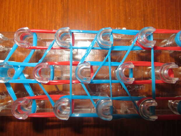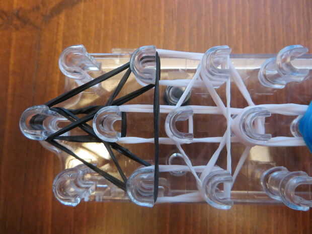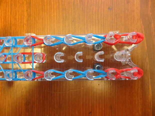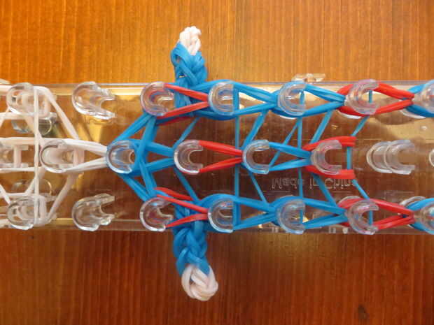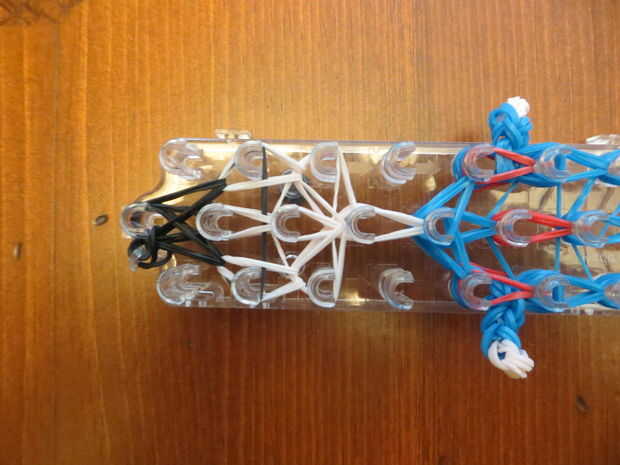 Para iniciar este paso vamos a poner en las bandas que circulan por tres clavijas para mantener unida a la figura. Para ello necesita duplicar una banda por cruzar sobre sí mismo para aumentar su estanqueidad. Hacer esto para cada punto indicado en el diseño y las fotos. excepto la 1/2 x marcado junto a él en el diseño, para, poner en la banda sin cruzar sobre pero en la tercera clavija torcerlo y enganchan en la clavija central. Otra vez Asegúrese de referirse a las imágenes para asegurarse de que lo haces correctamente. Próximo inicio colocación de las bandas de la misma manera como con los brazos hacia arriba de las columnas verticales hasta aproximadamente la zona de la cintura. Será necesario poner en los brazos. Te darás cuenta que hay 8 extremos se dividen en grupos de 4. En cada grupo de los 4 extremos de pone los dos pares en las dos clavijas indicadas en el diseño. Luego tienes 4 puntas en cada clavija. Hacer esto para ambos brazos a ambos lados. Después de esto guardar bucle cavando para el conjunto inferior de bandas y enganchando en la clavija superior. Hacer esto hasta llegar a la parte superior de la cabeza.