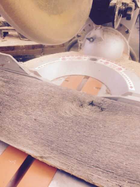 Medida y longitud del corte de vieja madera de granero al tamaño de la pistola. La culata y la parte del cañón que sobresalen más allá de la madera. Éste mide 23". Encontrar el punto entre la culata y el gatillo que va a quedar al ras con la parte inferior del barril - así que cuando monta el arma es nivel.