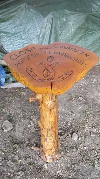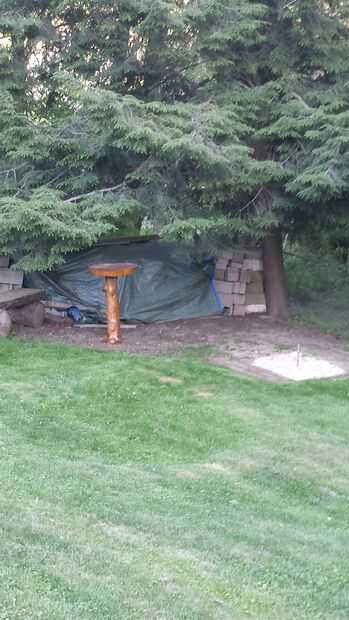 el año pasado cortamos abajo 2 noventa + pinos de los años que morían. Mantener los fondos y una parte superior de los árboles para mesas y una barra mesa de al lado el caballo zapato pitt. Hizo también un banco para el fuego hoyo pero me mostrará que uno más adelante.
