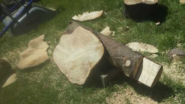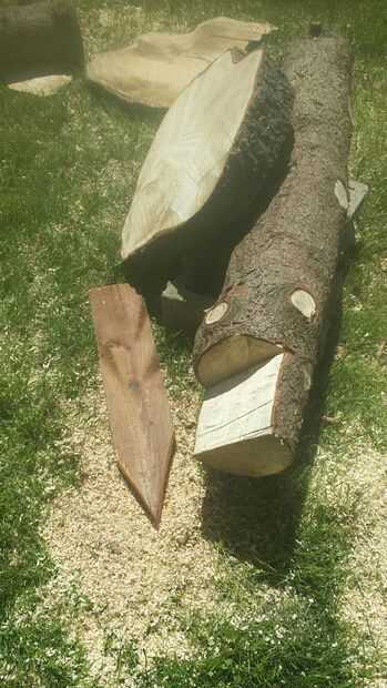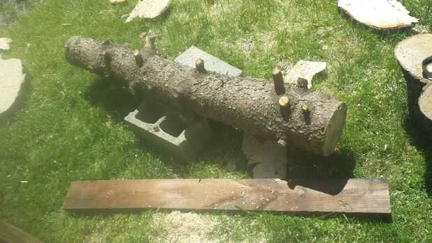Muesca de la base del tronco para poder acoplarlos a la estaca más adelante. La espiga que corte de un viejo 2 x 6 tenía puesta alrededor. Todo esto es darle a la tabla de una base firme.