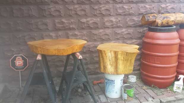 tenía a la izquierda en galón de mancha de color cedro de cuando hice mi deck. He utilizado esto en el tronco y la parte superior de la tabla, así como las tablas de finales. La mancha debe prolongar la vida útil de la madera y protegerla de los elementos.