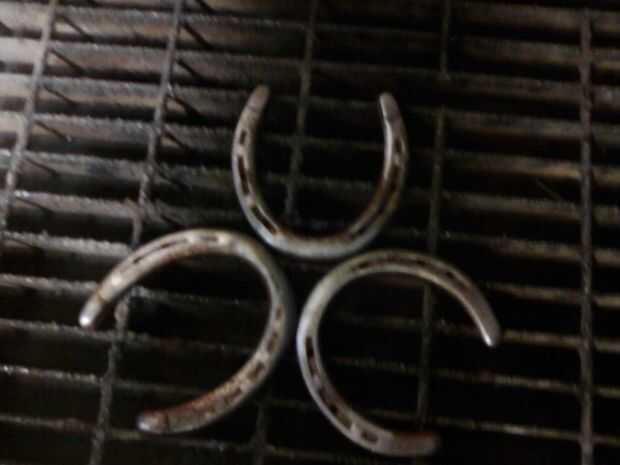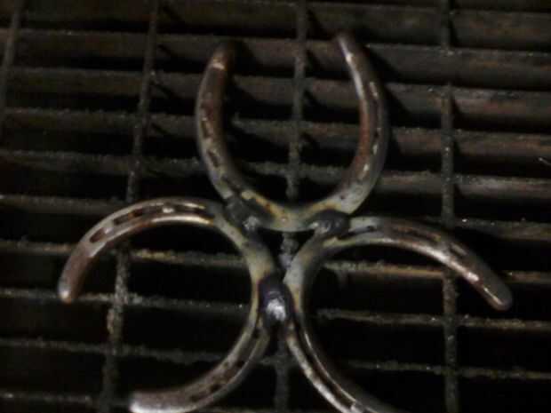 Ahora es momento de empezar a soldar. Puede ser difícil encontrar una máquina de soldar si usted no tiene uno. Fui a mi escuela y le preguntó si podía usar lo suyo. Cuando haya encontrado un lugar donde usted puede soldar con autógena, colocar todas la herraduras lado derecho hacia arriba en un triángulo con las piezas ronda tocan como se muestra en las fotos. Asegurarse de que usted está usando protección para los ojos y guantes de soldadura!