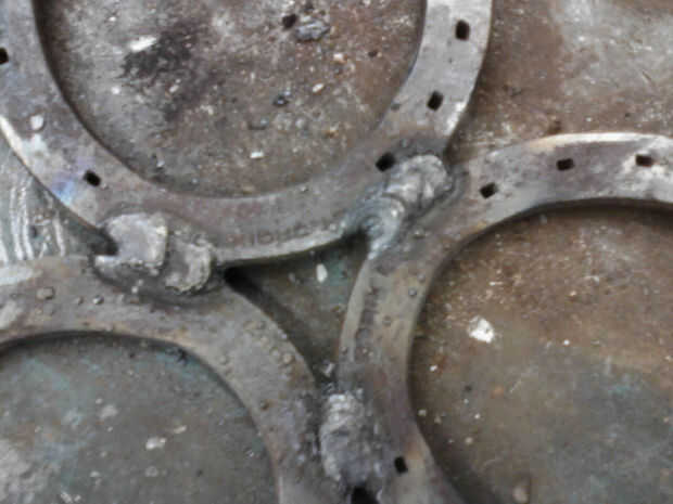Con un par de pinzas, tomar sus herraduras en algún lugar donde se puede colocar abajo. (Recomiendo una mesa de metal). Ahora presiona las herraduras a lo que usted tiene, usar el martillo a golpear de la escoria a la izquierda encima de la soldadura. (Esto demuestra lo buenos que son sus soldaduras).