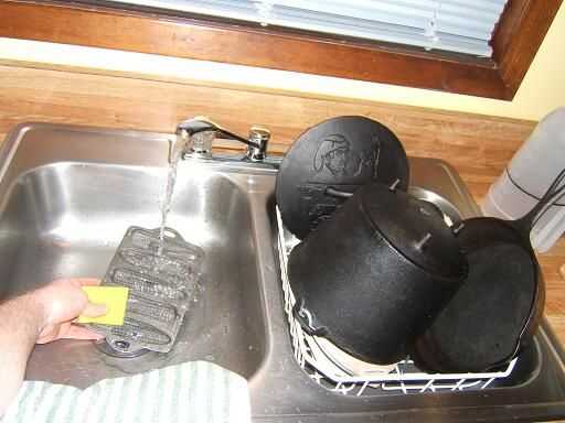 La limpieza es simple - utilice agua caliente. El más caliente, mejor. Una esponja con un lado liso y un lado abrasivo funciona bien para esto. Para la primera limpieza, fregado lo bien para eliminar cualquier aceite rancio, cera y otros restos de suciedad acumulado. Pequeñas manchas de óxido pueden ser lavadas hasta que el óxido se remueve. Puntos del problema de la roya pueden frotados con un pequeño trozo de papel de lija o algún tipo de herramienta giratoria. Pero recuerde: puntos pelados de metal es muy probables desarrollar moho rápidamente, así que tenga cuidado.