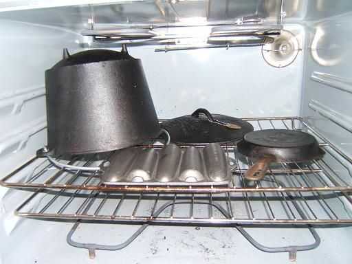 Colocar boca abajo en el horno durante 45 minutos y voltee para los 15 últimos. Durante esta hora, puede oler un poco gracioso, pero está bien. Puede abrir una ventana. El resultado será una buena capa de aceite al horno que ayudará a construir el condimento.