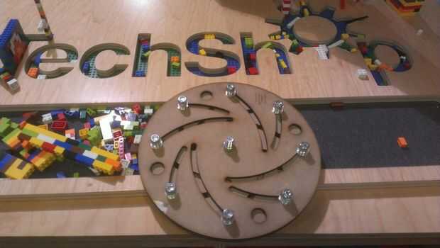 Como girar las dos piezas de MDF, las arandelas de acrílico de 1/4" tornillos mover hacia adentro y hacia afuera desde el centro del dispositivo.