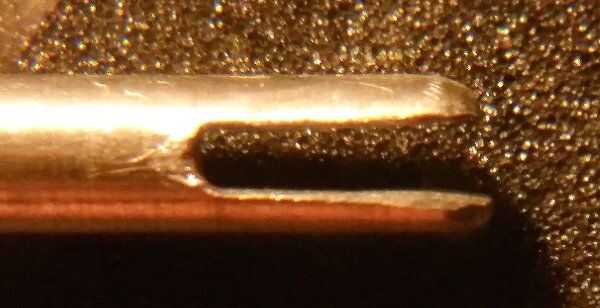 La ranura en el extremo redondeado no es necesario sin embargo. Lo hice con un disco de corte, pero una sierra para metales o aguja archivos sólo desean un poco más de paciencia. La ranura puede hacerse después de que la barra se dobla en asa, entonces es mucho más fácil constante en una abrazadera o vice - es difícil de sostener en una mano.