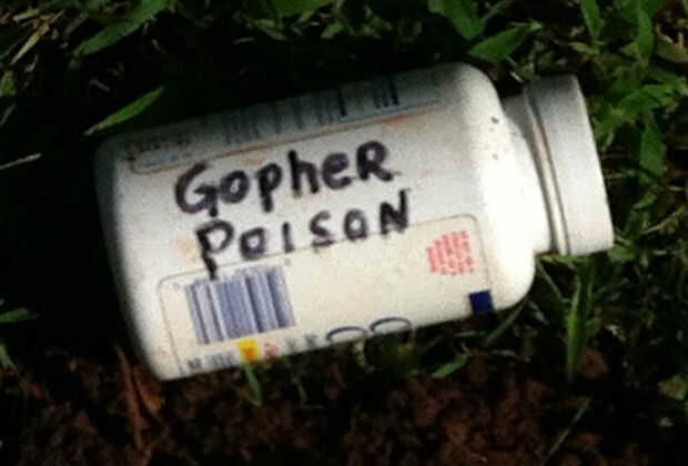 Gopher del veneno que contienen maíz y estricnina. Un amigo compró 30 libras y nos dividimos. Cuesta aproximadamente $20,00 por cada uno de nosotros y yo he estado usando a un ritmo de aproximadamente 1 libra por año controlando todas las tuzas en el barrio. CONSERVE ESTE CEBO FUERA DEL ALCANCE DE LOS NIÑOS Y LO ETIQUETA DE "VENENO"
