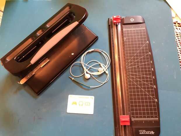 Sin embargo, para realmente transformar la tarjeta en un detangler brote de oído de la entropía, también necesitará dos herramientas: algo para cortar la tarjeta por la mitad (Yo utilicé un cortador de papel) y algo que meter dos agujeros en la tarjeta (yo usé mi perforadora de 3 hoyos). Someta a prueba cualquier puncher de agujero en un pedazo de chatarra para asegurarse de la parte más ancha de la clavija para tus audífonos se asoman fácilmente a través del orificio.