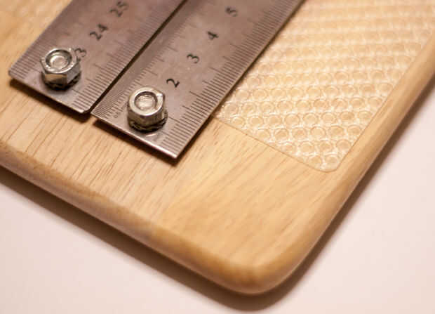 Medir el interior longitud entre los tornillos y también el ancho de la Junta y corte acortar un trozo de hoja de goma de aproximadamente 1 cm en ambas direcciones. Luego redondear las esquinas. Para unir la goma al tablero sugiero para usar una cinta transparente doble caras. Yo he hecho girar alrededor de la frontera y también, esto es importante, poner dos rayas exactamente bajo las reglas de acero.
