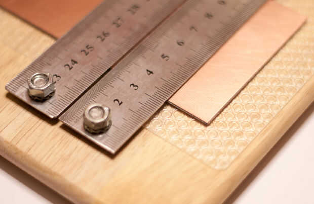 Ahora probar el grueso del espacio que queda debajo de las reglas. El pcb debe deslizarse con ninguna resistencia debajo de ellos, de hecho lo mantenga en lugar del pcb con un poco de presión sobre los gobernantes cuando te raspas, entonces será libre de salir también si es menor que la anchura de los gobernantes.