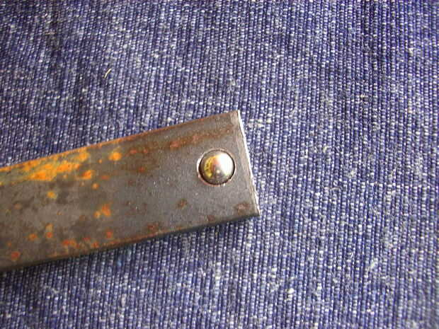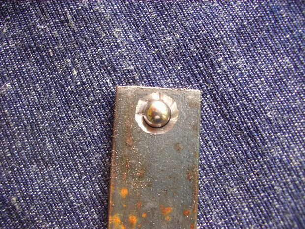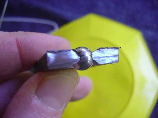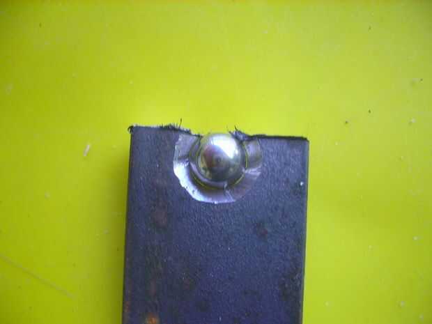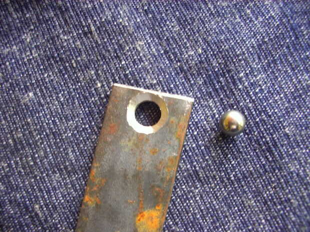 La bolita mide casi 8 m m de diámetro. Así hice un agujero de esa medida en una varilla de hierro. Luego avellané ambos lados del agujero, y corté con la inapropiada el borde del agujero más cercano al extremo de la varilla. Con algunos martillazos logré la bolita de acero quedara levantadoras apretada dentro del agujero.