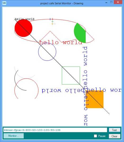 • Comandos de línea, rectángulo elipse, arco y pastel, rellenadas y sin relleno, Cruz y texto, en varios tamaños y orientaciones y en 5 colores.