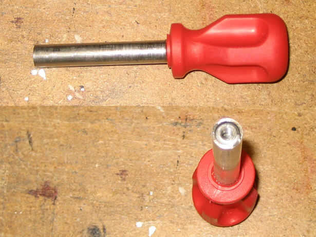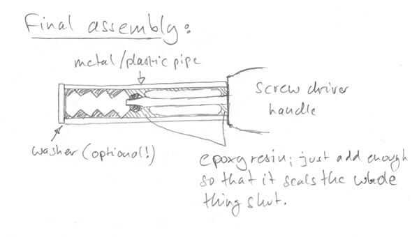 Nota: en realidad, usando este método, no es necesario que la punta del conductor y la ranura en el cilindro del sello del cilindro, pero he cambiado mi enfoque en el proceso de fabricación de la herramienta. Originalmente, el plan era salir el cilindro en el tubo y agregar la resina desde el back-end y tener que cubrir el interior las paredes del cilindro. Luego fui insertar el controlador y la vuelta el artilugio con el' negocio' hacia la tierra. La resina entonces fluiría lentamente hacia abajo el tubo y la cubierta connectin entre la punta del conductor y el cilindro como en la foto en el esquema. Cambiar mi plan permitida dos aplicaciones separadas de la resina para que tanto el extremo de la tubería está conectado a la manija del conductor y suficiente resina está todavía en la región donde se unen la punta y la ranura.