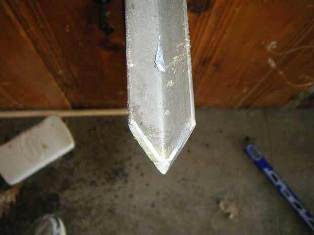 En orden para esta herramienta cavar fácilmente en el suelo que necesita cortar un ángulo en un extremo del hierro de ángulo. Trataron de cortar a 45 * ángulo pero realmente solo ojo-balled lo. Solo tienes que ser lo suficientemente "puntiagudos" para penetrar en la tierra pero no empinada para agarrar las raíces difíciles. Utilizar la sierra alternativa otra vez para este corte, pero luego terminó con un molino equipado con una rueda (la amoladora es MESSY pero mucho más fácil y rápido para hacer cortes con) de corte.