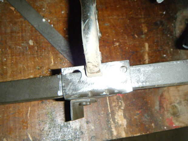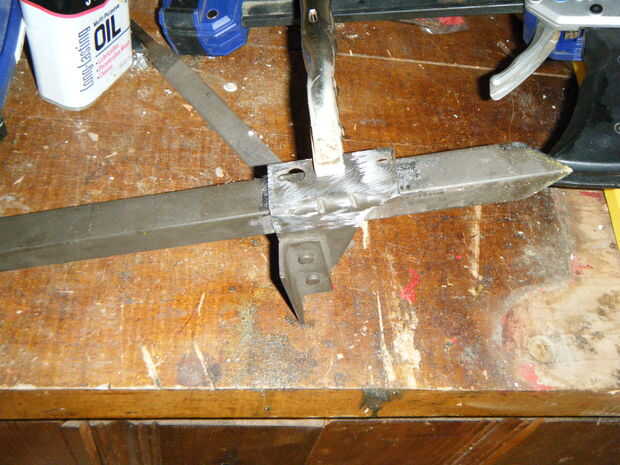 usé vice grips para la a las partes junto con la parte inferior de la abrazadera de 4" hasta de la punta.  Utilizando un soldador MIG soldado alrededor de cada lado (perdón por la falta de imágenes de este proceso).