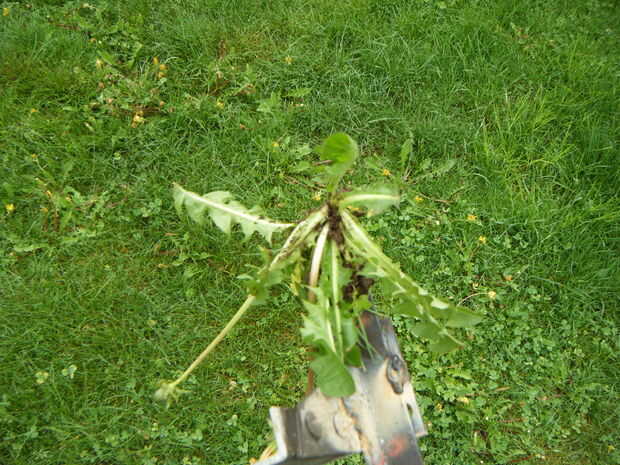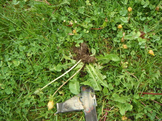 Antes de llegar demasiado lejos lo probé afuera en la maleza al lado del garaje. Lugar la herramienta en el suelo con energía (o uso el pie peg si el suelo es duro/rocky), palanca hacia atrás y esperar a que el * pop * de la raíz.