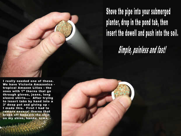 Para utilizar, presione el extremo de la espiga del PVC en el suelo sobre 3-4". Deje caer una tableta de estanque en el extremo superior. Inserte el pasador y presionar. Dependiendo de cómo el ajuste el pasador es, usted puede enrollar para inyectar agua en el suelo. Para evitar esto tienes dos opciones. Dejar la espiga al presionar en el suelo - o - lo que hice - perfore unos agujeros cada pocas pulgadas en la tubería de PVC para que el agua fluya hacia adentro y hacia afuera.