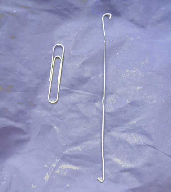 Necesitaba para limpiar el desagüe (de nuevo) ayer, pero en lugar de la suciedad agujas y pinzas de nariz larga, rápidamente creé este pequeño gancho de pesca de un clip de papel grande (aunque cualquier alambre rígido habría hecho el trabajo).