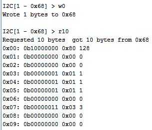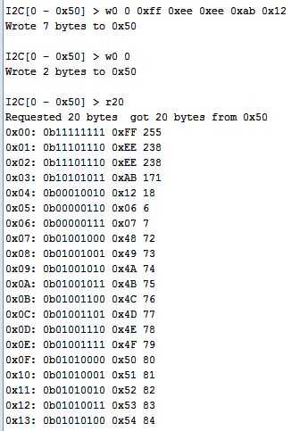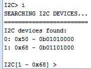 D1. Tipo 'i' Tt Compruebe los dispositivos actualmente conectado. Esto lista de las direcciones de todos los dispositivos en el bus (gracias a Krodal). En mi caso 0 x 50 es la EEPROM, 0x68 es el reloj de tiempo real DS1307. La última dirección será autoselected para las siguientes operaciones.