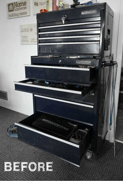 Obviamente tenemos una gran variedad de herramientas y materiales para fijar lo que podría ser traído en la puerta. Habíamos estado guardando las fuentes en un pecho de herramienta de balanceo Mastercraft, pero se estaba haciendo un verdadero lío y encontrar un elemento determinado a menudo requerido buscando en cada cajón.
