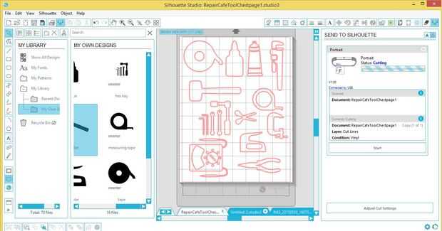 Una vez que estábamos contentos con la manera en que se organizó, miramos en línea de iconos representar qué suministros ir donde. Encontramos los iconos de la herramienta como .png gráficos en la página web del proyecto Sustantivo y había importado en el programa de estudio de la silueta.