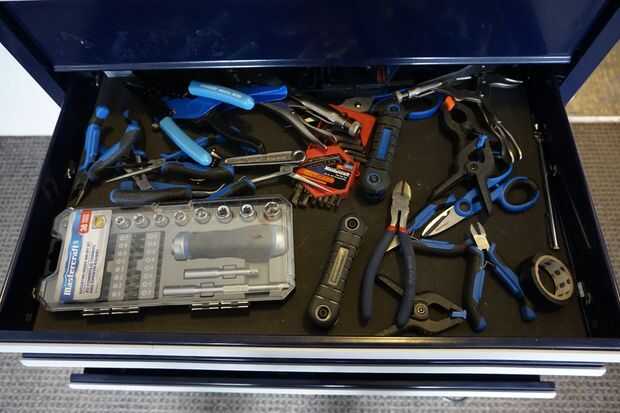 Primero, sacó todo el pecho de herramienta y lo ordenan. Los artículos fueron agrupados por tipo y poner en los cajones de tamaño adecuados (es decir, pequeños artículos planos en los cajones pequeños) y más alto / más grande en los cajones más grandes.