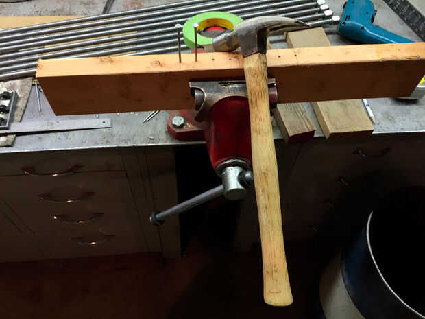 Coge el martillo y algunos clavos las marcas realizadas o en los orificios piloto. Acabo de hacerlos más cerca posible a centrada en el borde de la 2 X 4. En cuanto a la profundidad de las uñas, honestamente, simplemente adiviné. Parecía apropiado. De ninguna manera, soy carpintero.