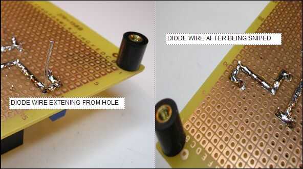 Diodo (D2-R2) tendrá un alambre tirado a través en el agujero X11. Soldadura a través de él con el cordón de soldadura y en el recorte final de izquierda sobre el alambre como cerca del cordón de soldadura como puedas.