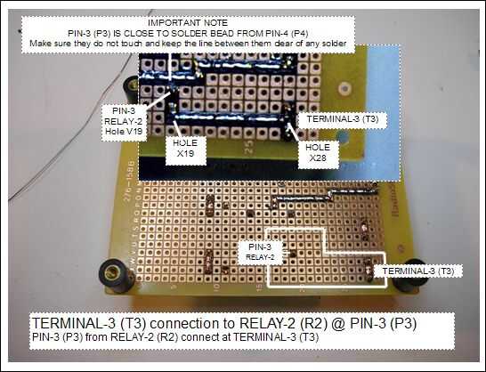 el PIN 3 (P3) relé-2 (R2) es junto al cordón de soldadura de perno-4 (P4) en el relé-2 (R2). Mantener el salto de línea entre la soldadura. Si se unen a este proyecto no funcionará correctamente y podría corta la herramienta hacia fuera. NO COMETE ERRORES AQUÍ!