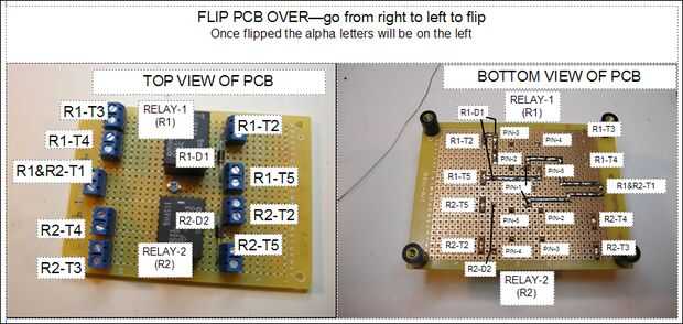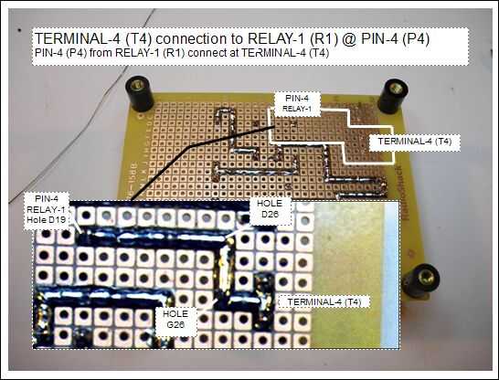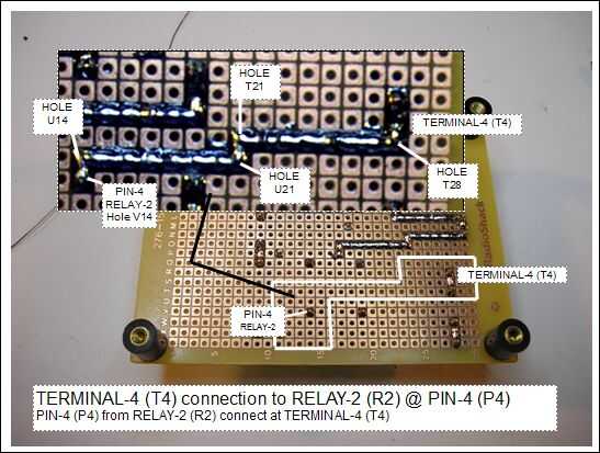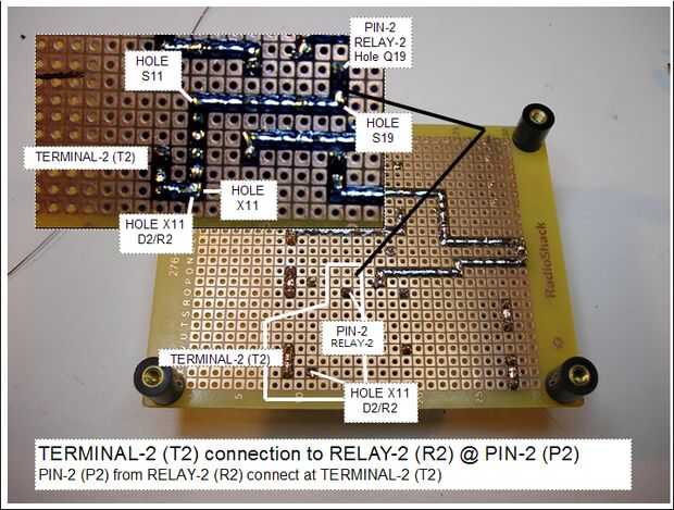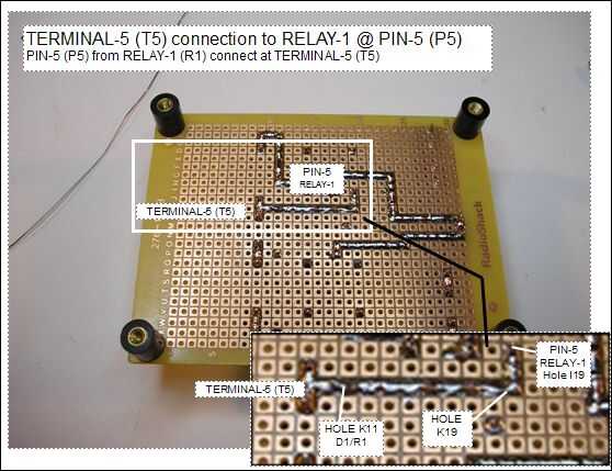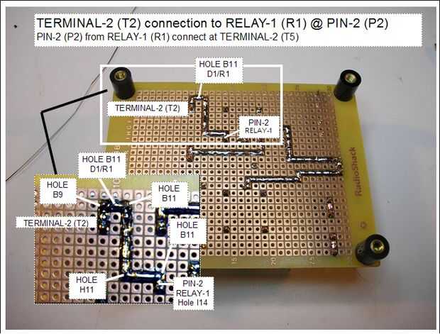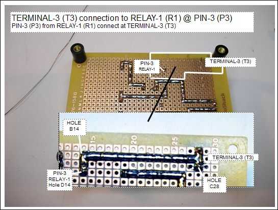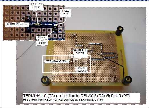 Alambre de diodo se va desplazando a través de los agujeros al conectar con TERMINAL-5 (T5) TERMINAL de 7-2 (T2) para el relé-1 (R1) y relé-2 (R2). Cada vez que esto sucede la manija en la misma forma. Soldadura alrededor del orificio que sale el hilo con el cordón de soldadura. Una vez que la conexión se hace cortar el alambre de diodo extra el. SER cuidadoso - hold a o volará hacia fuera en usted!!!!!!