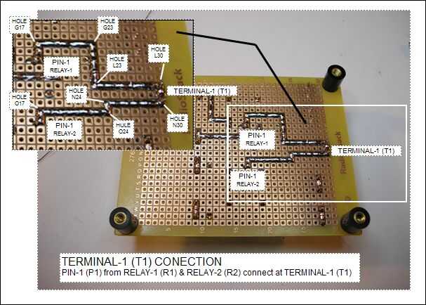 La soldadura de perno-1 (P1) de relé-1 (R1) y relé-2 (R2) a TERMINAL-1 (T1)